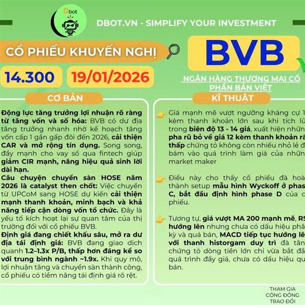 Dbot khuyến nghị BVB với giá 14.300. Hôm nay đã bắt đầu có lãi rồi nhé ạ