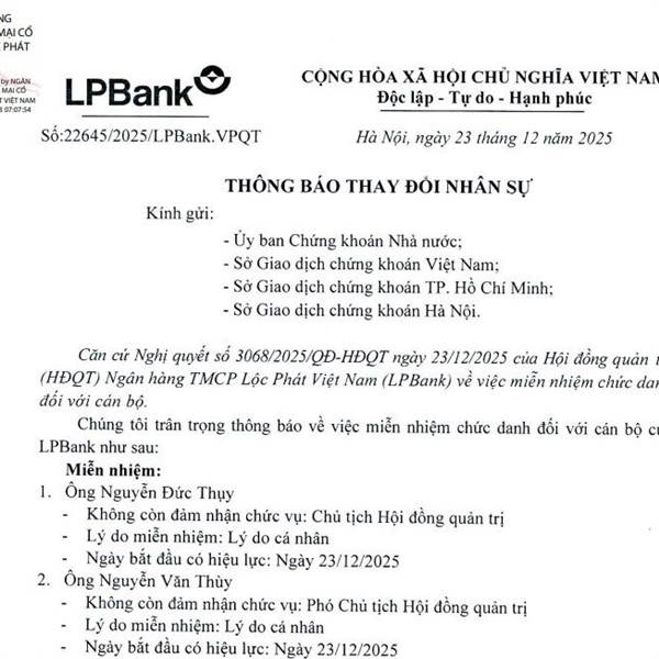 Ông Nguyễn Đức Thuỵ thôi làm Chủ tịch HĐQT LPBank (LPB)