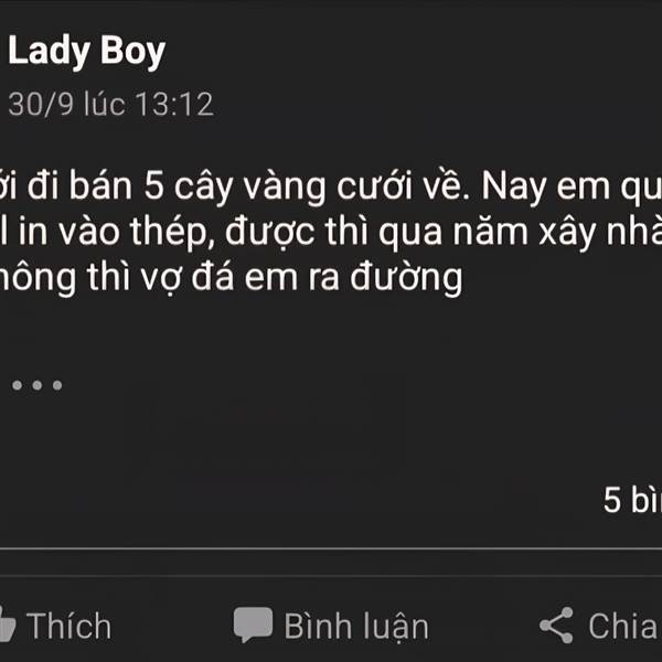 Em mới đi bán 5 cây vàng cưới về. Nay em quyết tâm All in vào thép, được thì qua năm xây nhà ở quê, không thì vợ đá em ra đường