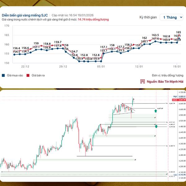 VÀNG THIẾT LẬP ĐỈNH CAO MỚI 4690 USD - DÒNG TIỀN TRÚ ẨN CHƯA RÚT Cập nhật và nhận định giá Vàng 19/01/2026: -------- I. CẬP NHẬT GIÁ VÀNG Giá vàng trong nước: 🔹 Vàng miếng SJC: Mua vào 163 triệu – Bán ra...Thêm
