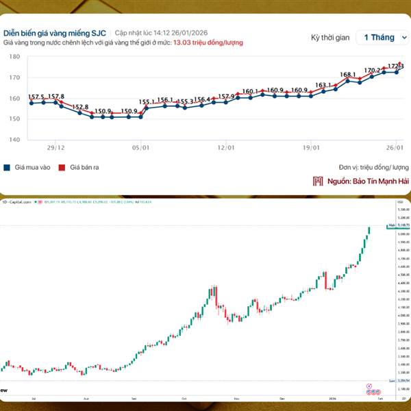 VÀNG LẬP ĐỈNH MỚI - XU HƯỚNG TĂNG VẪN ĐANG CHIẾM ƯU THẾ Cập nhật và nhận định Vàng ngày 26/01/2026: -------- 📍 Vàng trong nước (SJC): ▪ Mua vào 174,5 triệu đồng/lượng – Bán ra 176,5 triệu đồng/lượng. ▪ Ch...Thêm